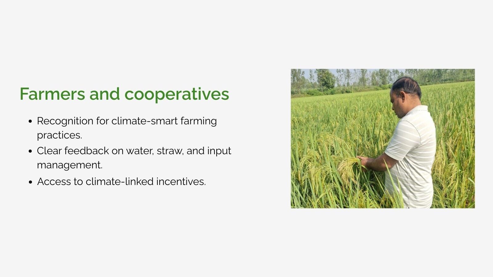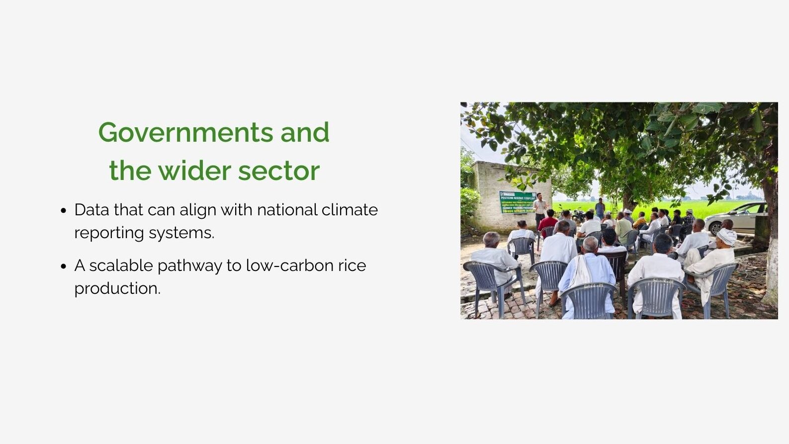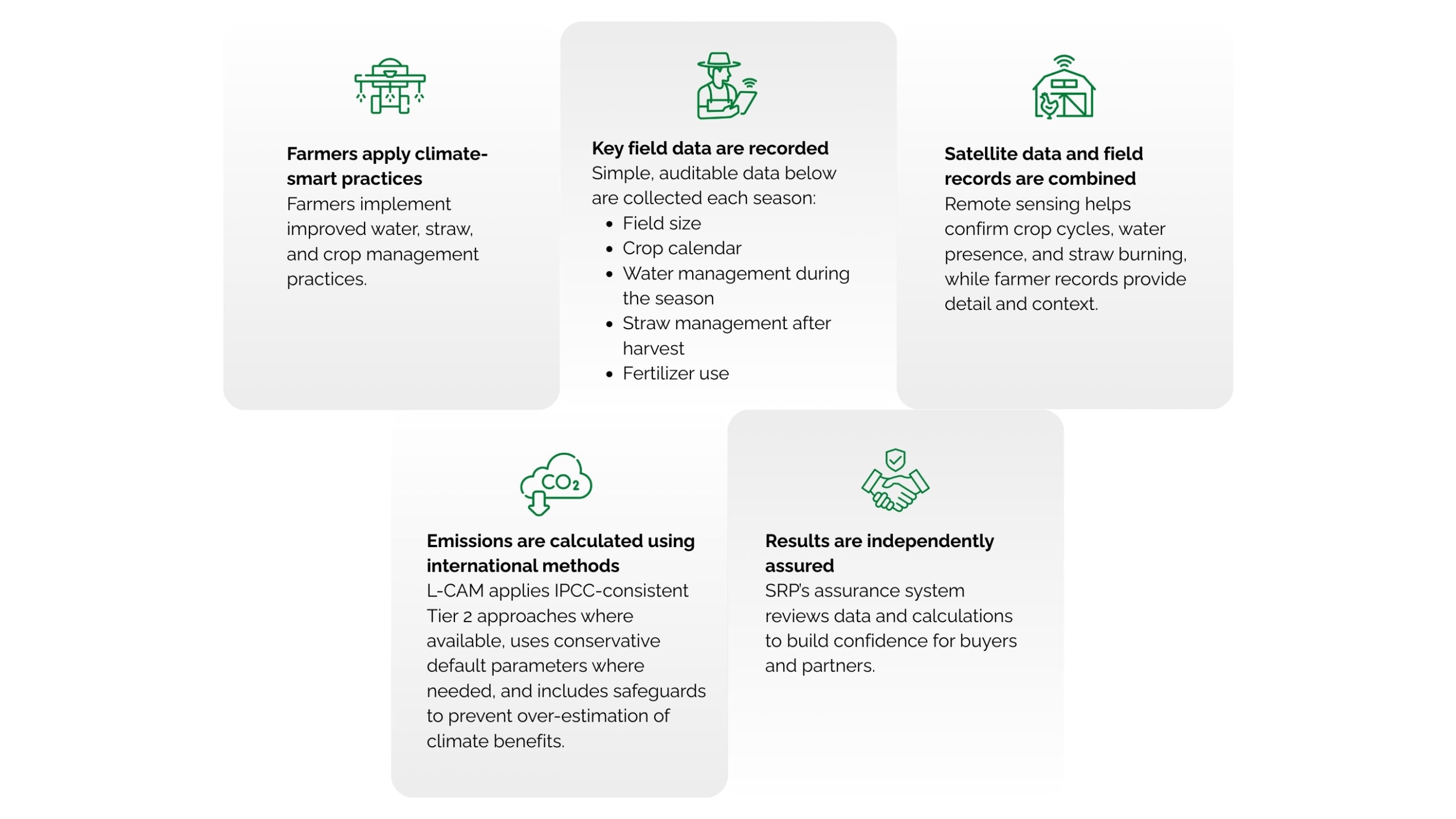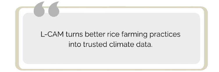 Rice cultivation can be a significant source of methane emissions, particularly under prolonged flooding. Facilitated by SRP, the Low-Carbon Assurance Module (L-CAM) is developed to help measure, verify, and communicate greenhouse gas reductions from rice farming in a credible, practical, and scalable way. It links on-farm practices, such as water and straw management, to measurable climate outcomes without creating additional burdens for farmers.