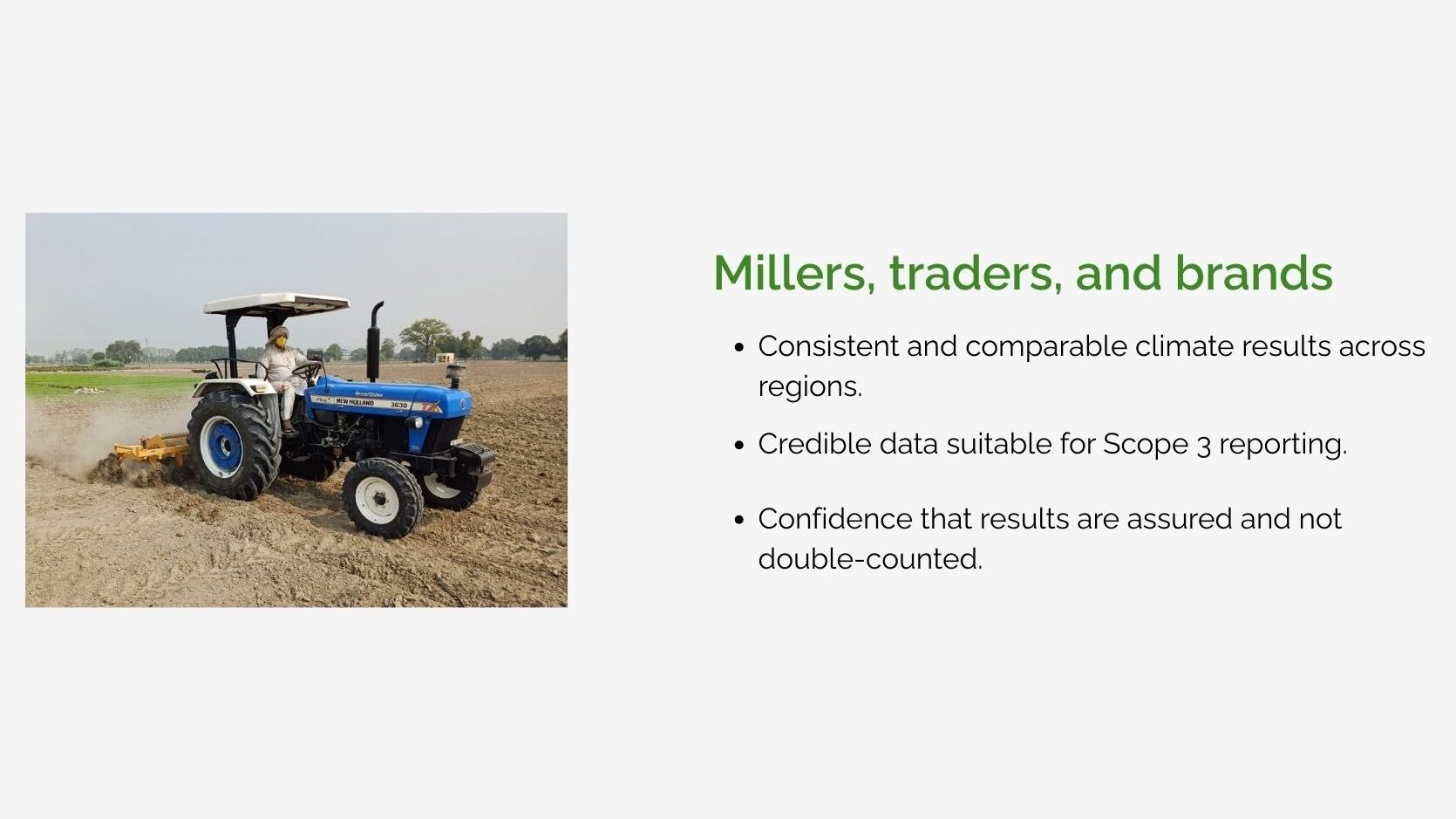 Implementation was carried out in close collaboration with value-chain partners LT Foods and Ebro India, ensuring that L-CAM was tested within operational farming and sourcing systems rather than controlled or artificial settings. To support robust measurement, reporting, and verification, Regrow acted as the MRV partner, helping to operationalize data collection and climate performance assessment.