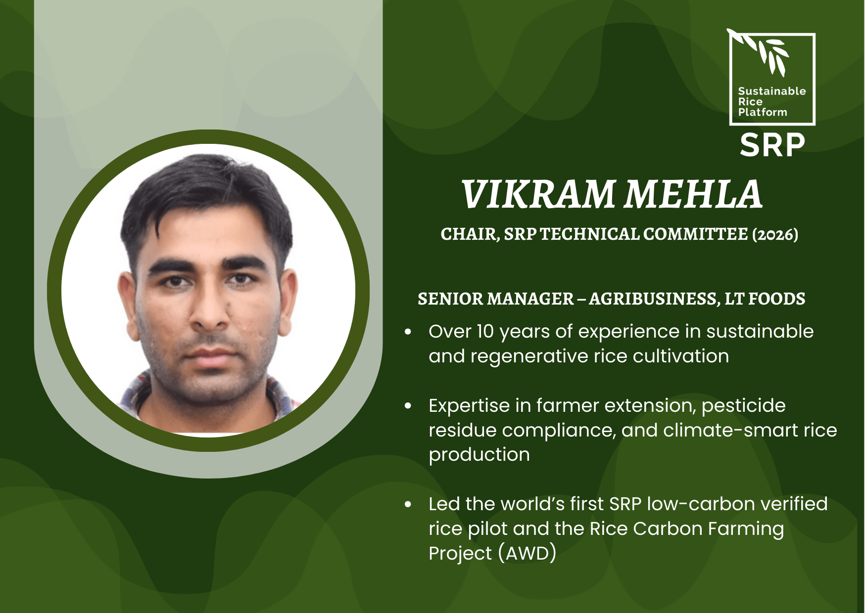 Sustainable Rice Platform (SRP) is pleased to welcome Vikram Mehla, Senior Manager-Agribusiness at LT Foods, as the newly elected Chair of the SRP Technical Committee (TC) for 2026. Vikram brings over a decade of experience in advancing sustainable and regenerative rice cultivation, working closely